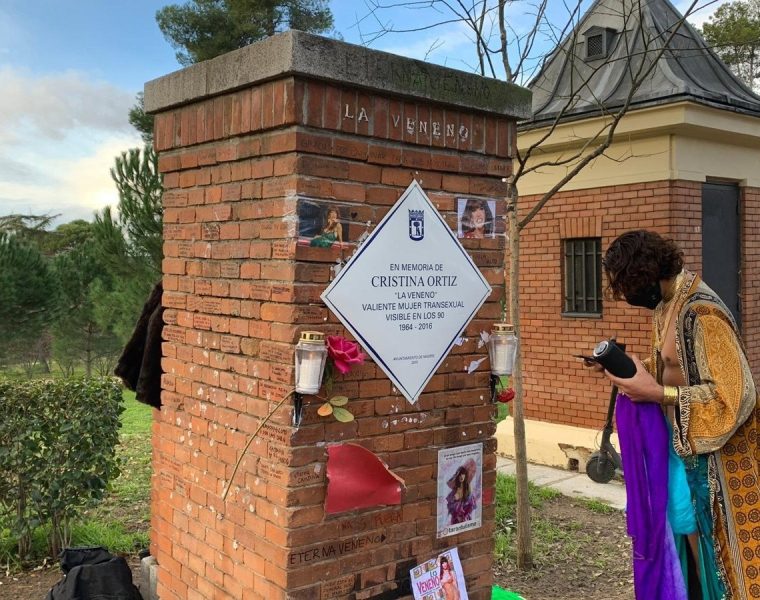 El segundo espacio emblemático es una placa en honor a Cristina Ortiz, conocida como La Veneno, situada en el Parque del Oeste de Madrid. Esta placa fue instalada en 2019 tras una propuesta de la asociación LGTBI Arcópoli y recoge la inscripción «En memoria de Cristina Ortiz, ‘La Veneno’, valiente mujer transexual visible en los años 90», reconociendo su contribución a la visibilidad de las personas trans y su impacto social y cultural en España.