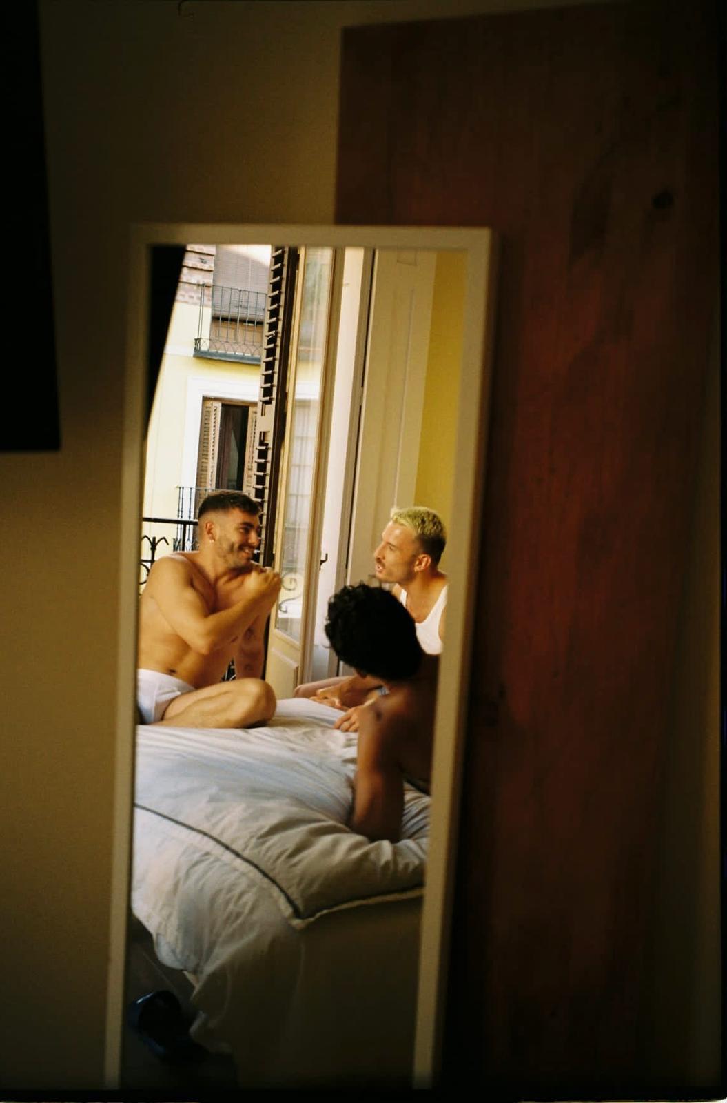 Tres jamás fueron multitud. Eso deja entrever la relación de Cris Campbell (36), Rubén Montero (37) y Adrián Montoro (30). La tarde se presentaría tranquila de no ser por esta entrevista. La pareja es casera. Nada como estar todo el fin de semana bajo el edredón en el sofá, defienden. Y menudo sofá, menuda cama: de 2×2. A escasos pasos de un balcón con vistas al Madrid castizo, Cris avisa: «Una relación poliamorosa requiere una mentalidad deconstruida para establecer mejor tus