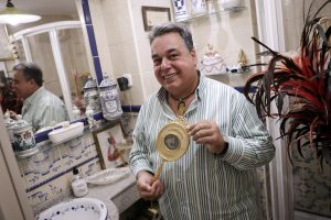 El ‘tour’ por el apartamento inicia una soltura de nombres de «categoría». La tenía Malena y la guarda su legatario cuando muestra un pin, condecoración de la reina Victoria Eugenia en 1925. La joyería artesanal en marfil de Matilde Paulat, el Cristo yacente en bronce de Benlliure, la pulsera de oro del rey Hassan II y el abanico con varillaje de nácar y país de vitela de la abuela de Juan Carlos I. A pocos metros, el segundo baño, con espejo regalo de Miguel de Molina.